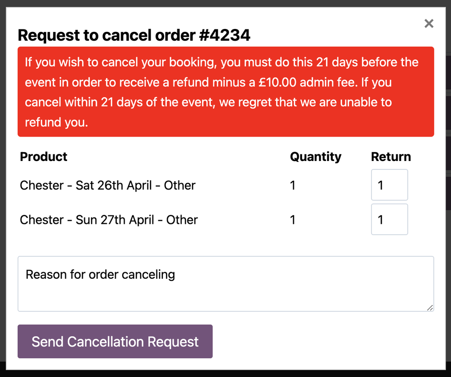In this window, you will need to choose which market(s) you want to cancel and make sure that there is a '1' in the 'Return' box. Enter your reason and click on 'Send Cancellation Request'.